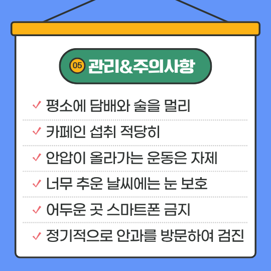 - 안압을 낮춰 시신경을 보호해야 함