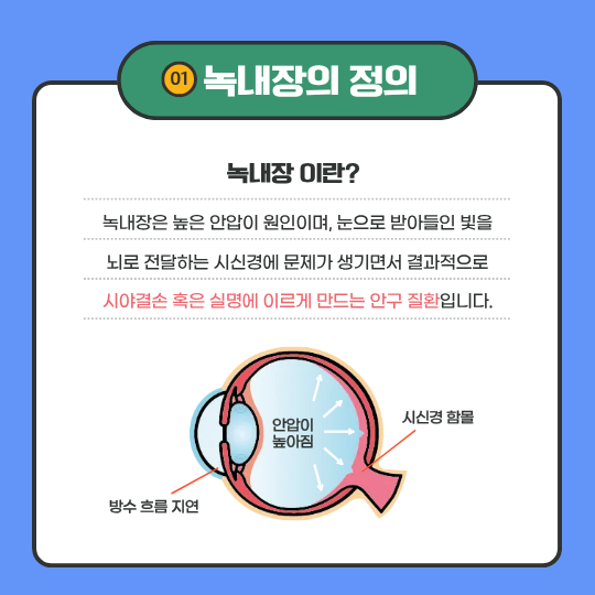 녹내장은 눈 속 압력(안압)이 올라가면서 시신경이 손상되는 질환입니다.